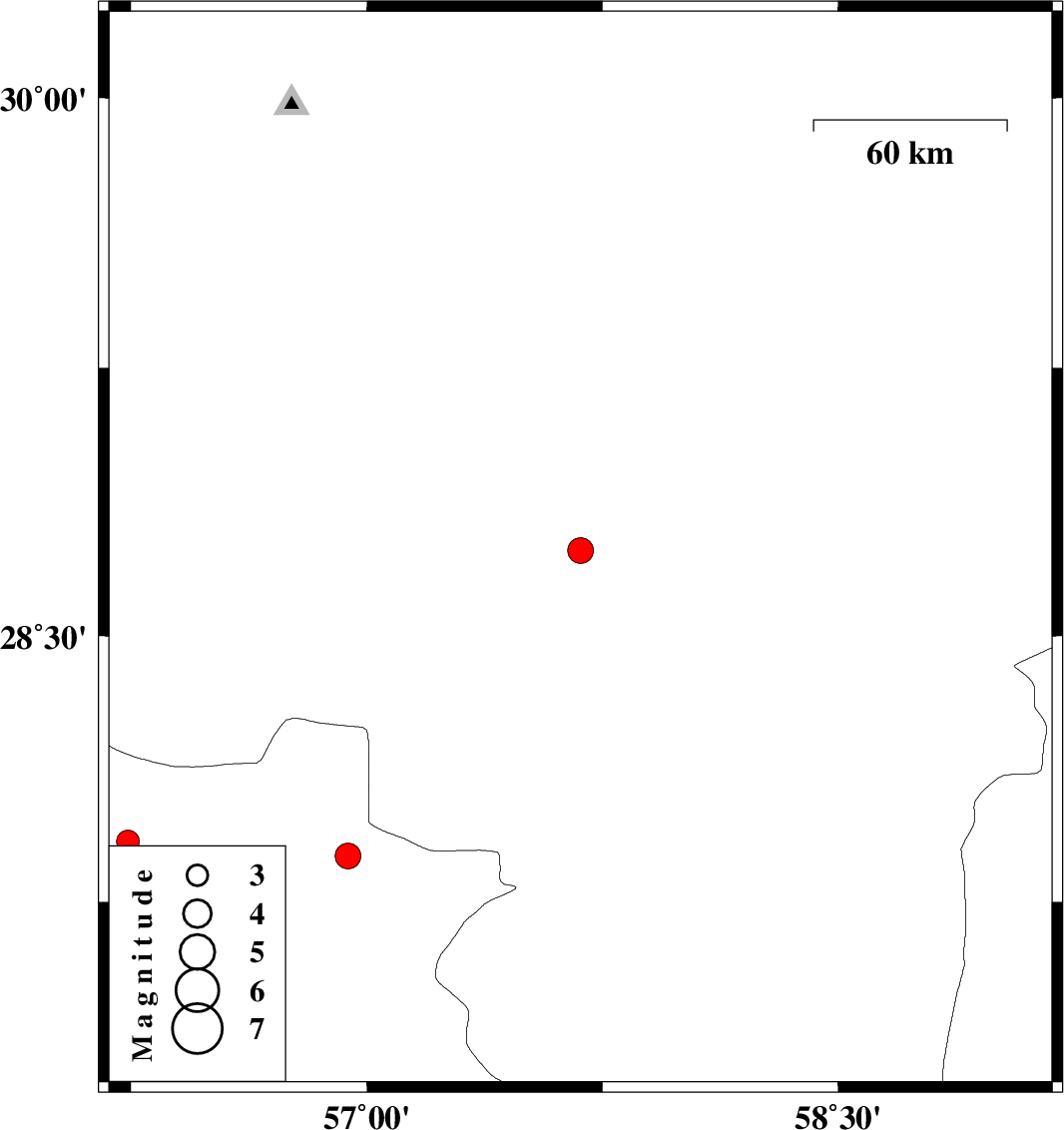 | 2009/01/21 | 14:26:30.6 | 17:56:30.6 | 27.88 | 56.94 | 24 | ML:3.6 | 58 km North-West of Dehbarez, Hormozgan Province | ||