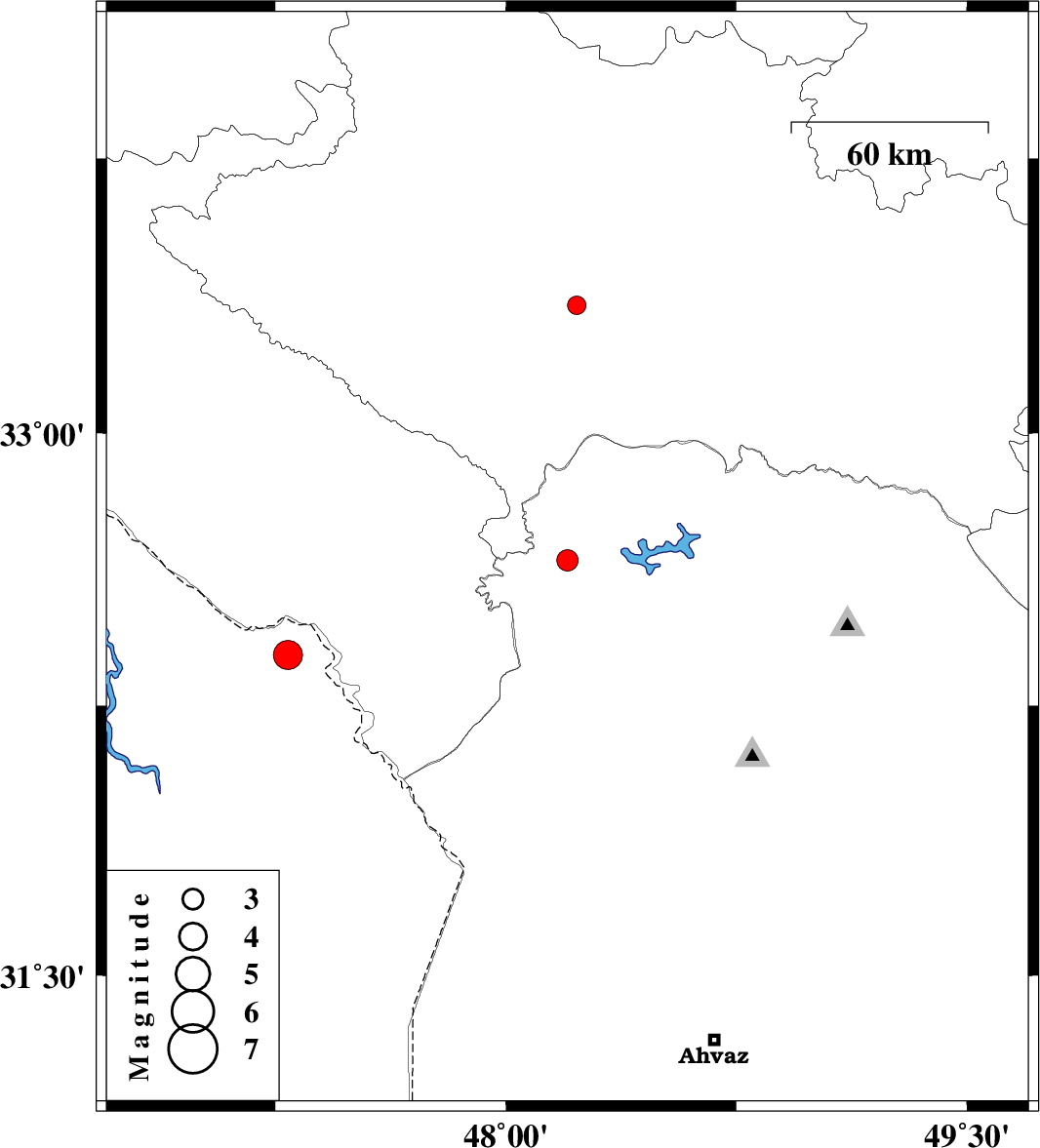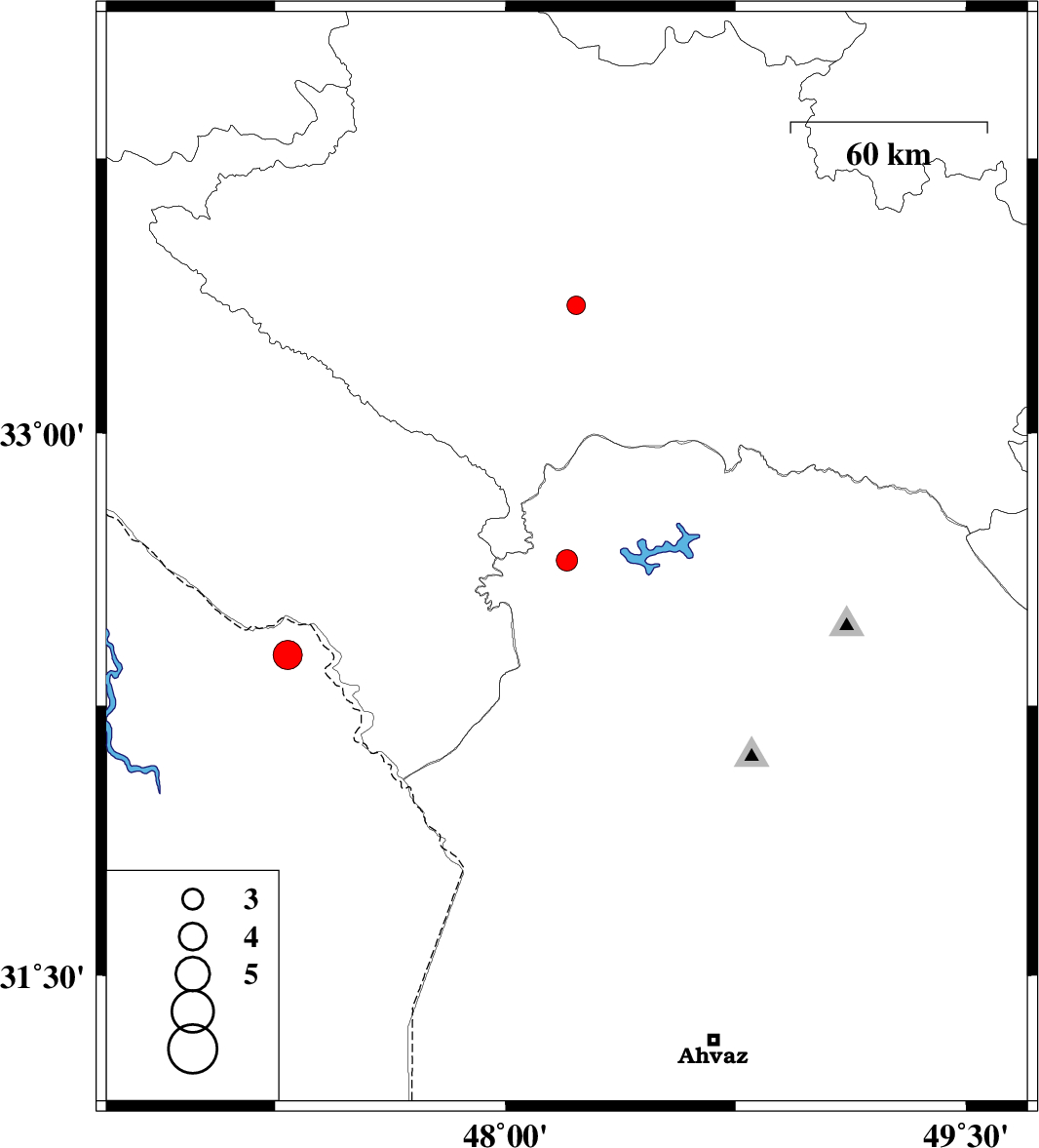 | 2009/01/23 | 01:49:47.7 | 05:19:47.7 | 33.35 | 48.23 | 18 | ML:2.7 | 19 km South-West of Khorramabad, Lorestan Province |