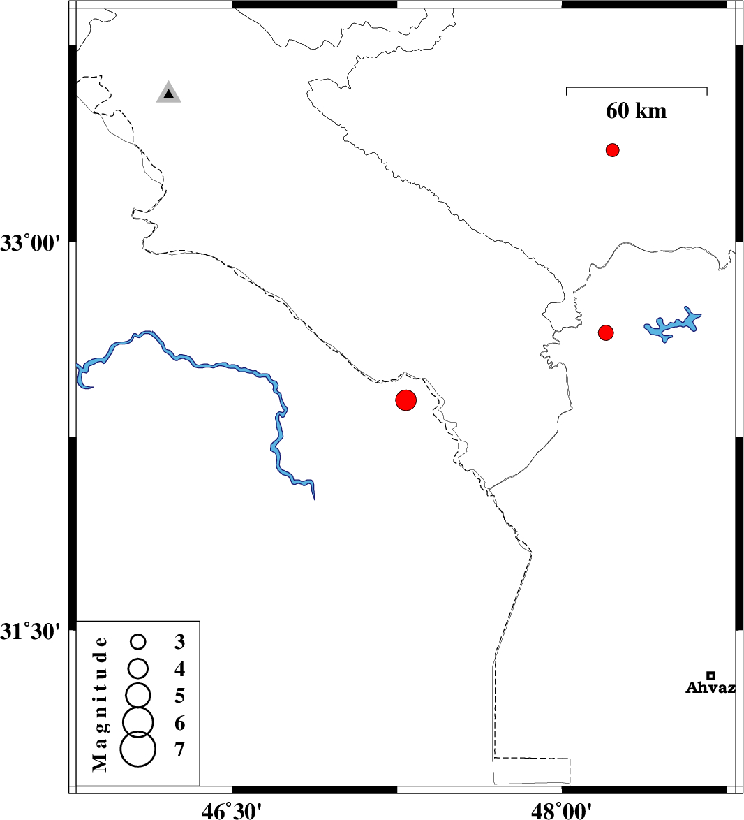 | 2009/01/23 | 01:49:47.7 | 05:19:47.7 | 33.35 | 48.23 | 18 | ML:2.7 | 19 km South-West of Khorramabad, Lorestan Province |