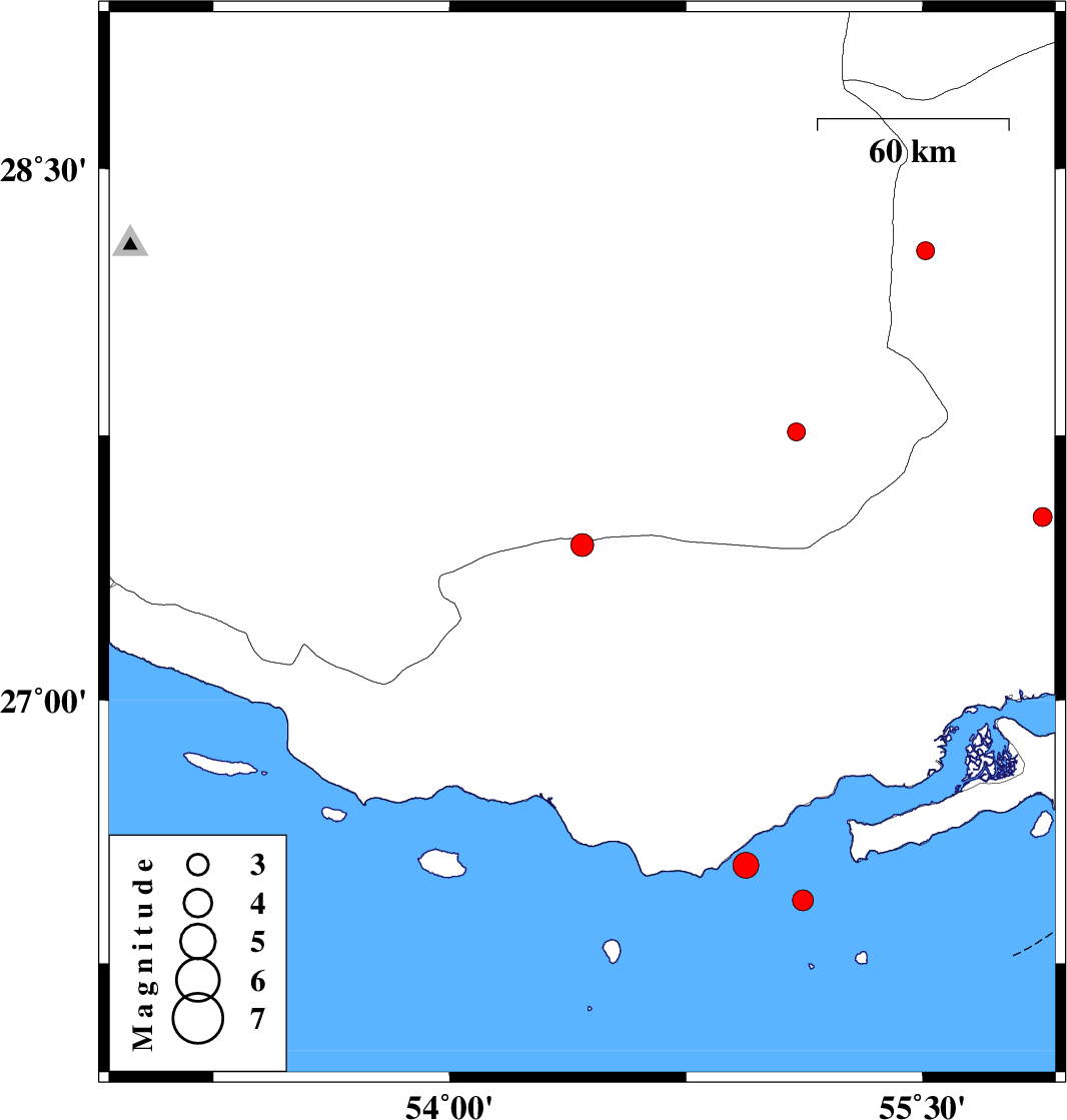 | 2009/01/08 | 23:05:02.0 | 02:35:02.0 | 26.43 | 55.12 | 14 | ML:3 | Persian Gulf, 28 km East of Bandar-e lengeh | ||