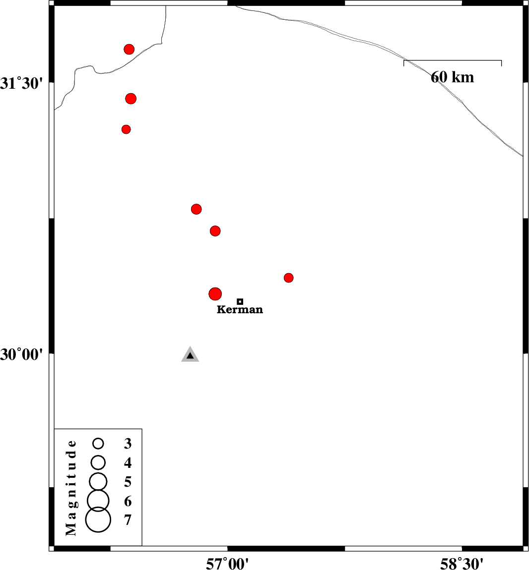 | 2009/01/10 | 22:47:14.3 | 02:17:14.3 | 30.8 | 56.8 | 14 | ML:3 | 22 km East of Zarand, Kerman Province |