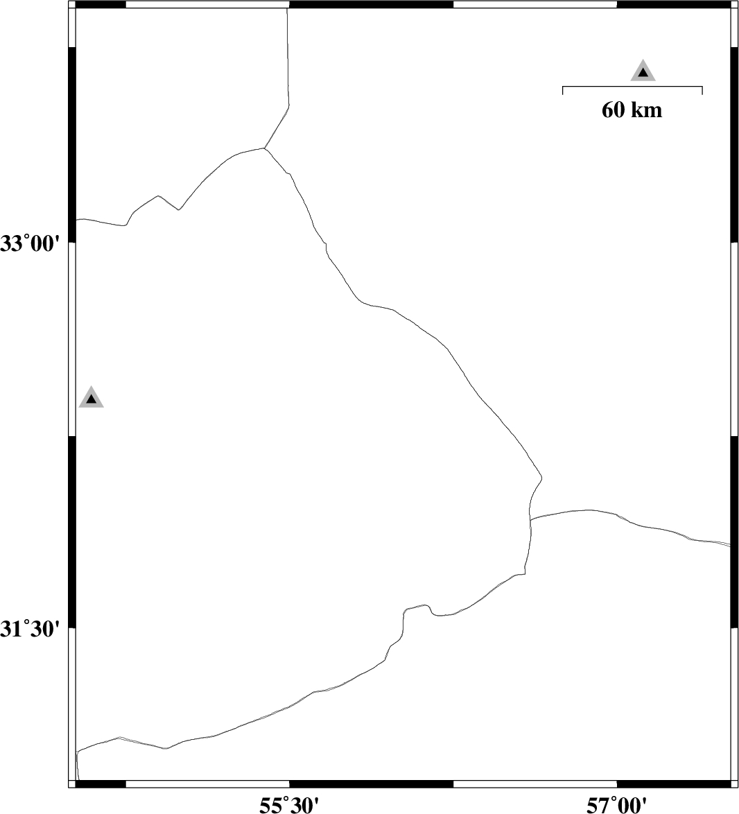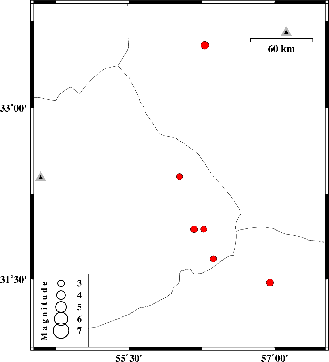 | 2009/02/05 | 15:45:16.7 | 19:15:16.7 | 31.68 | 56.37 | 14 | ML:2.9 | 62 km North-West of Ravar, Kerman Province | ||