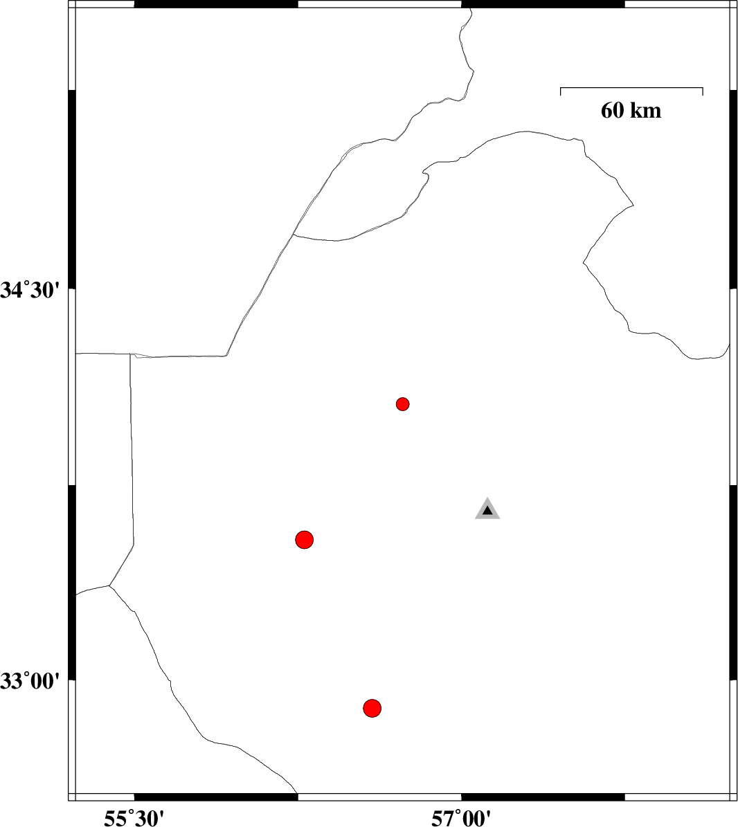 | 2009/02/08 | 06:30:41.9 | 10:00:41.9 | 34.06 | 56.73 | 4 | ML:2.7 | 54 km North-West of Tabas, Yazd Province | ||