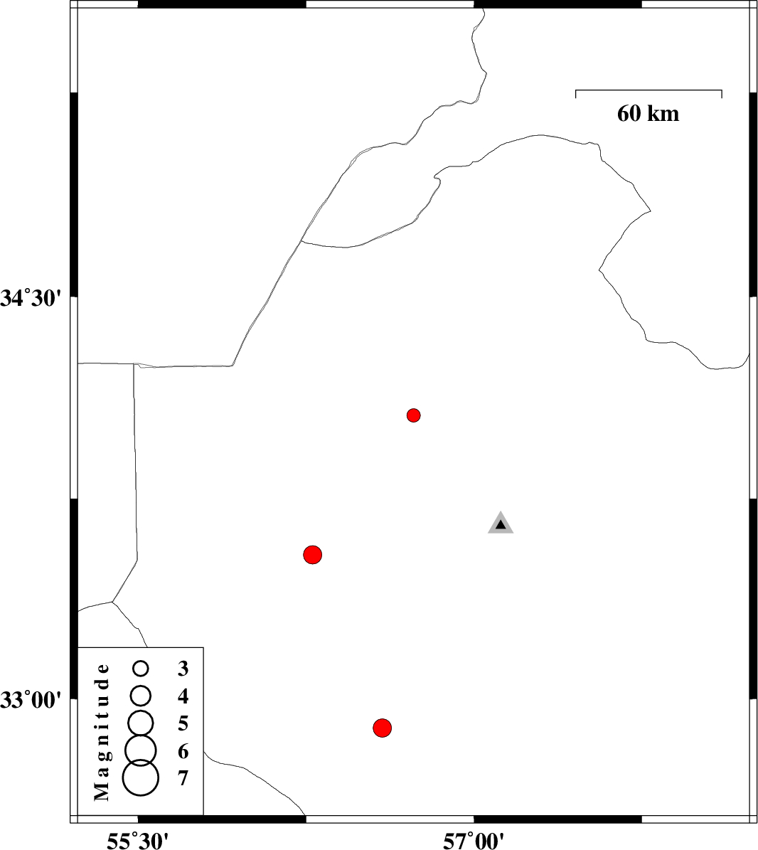 | 2009/01/24 | 05:50:33.4 | 09:20:33.4 | 32.89 | 56.59 | 14 | ML:3.6 | 84 km South-West of Tabas, Yazd Province |