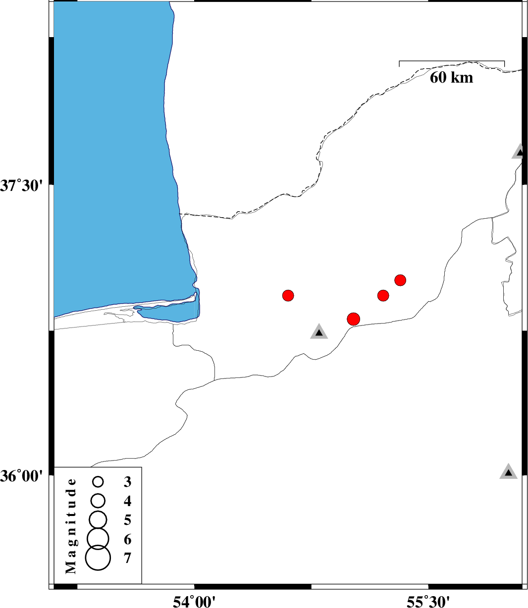 | 2009/02/11 | 12:46:41.6 | 16:16:41.6 | 36.93 | 54.6 | 39 | ML:3.2 | 16 km East of Aq Qaleh, Golestan Province | ||