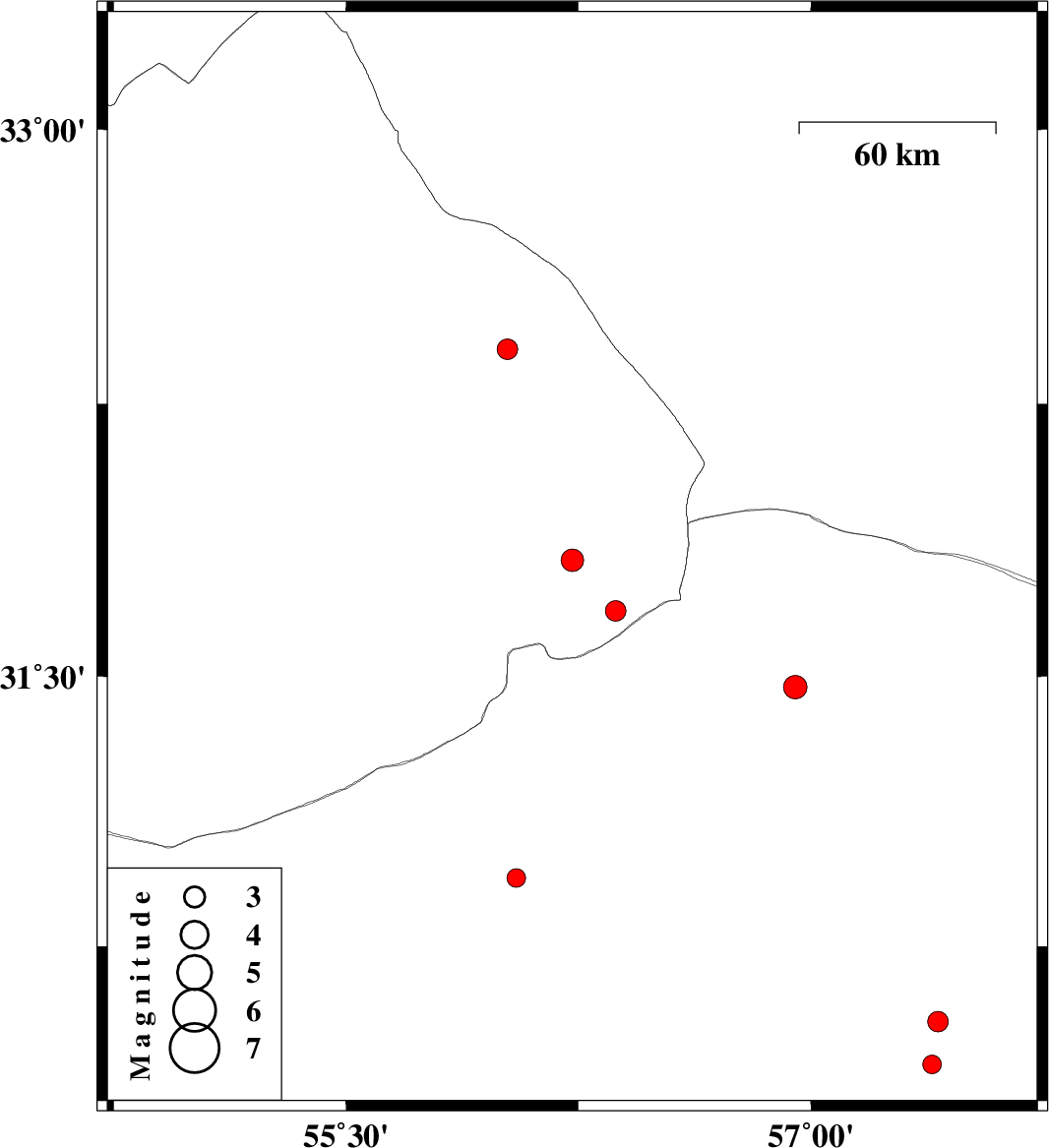 | 2009/02/05 | 15:45:16.7 | 19:15:16.7 | 31.68 | 56.37 | 14 | ML:2.9 | 62 km North-West of Ravar, Kerman Province |