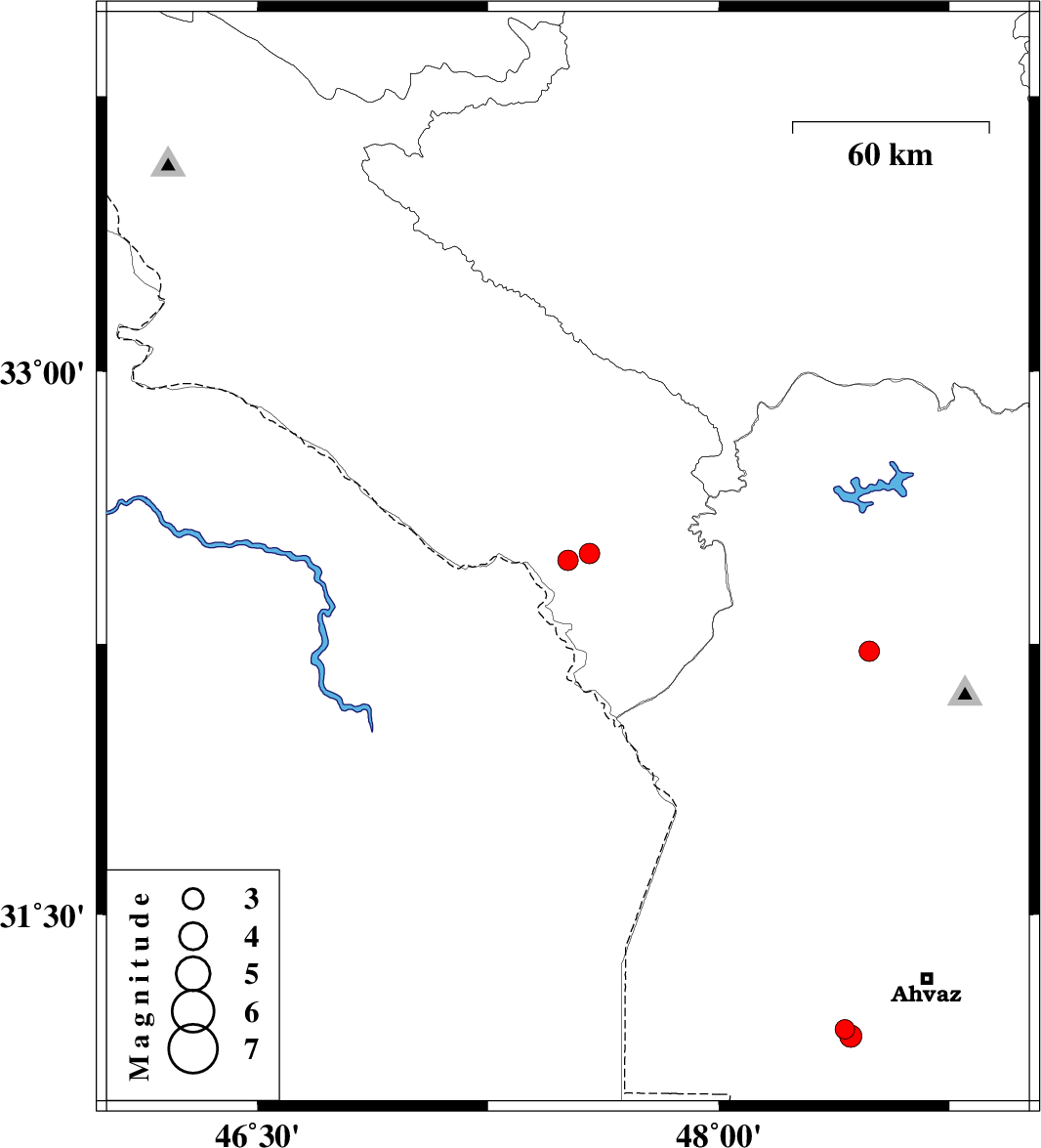 | 2009/02/07 | 10:31:09.3 | 14:01:09.3 | 31.16 | 48.43 | 30 | ML:3.2 | 29 km South-West of Ahvaz, Khoozestan Province |