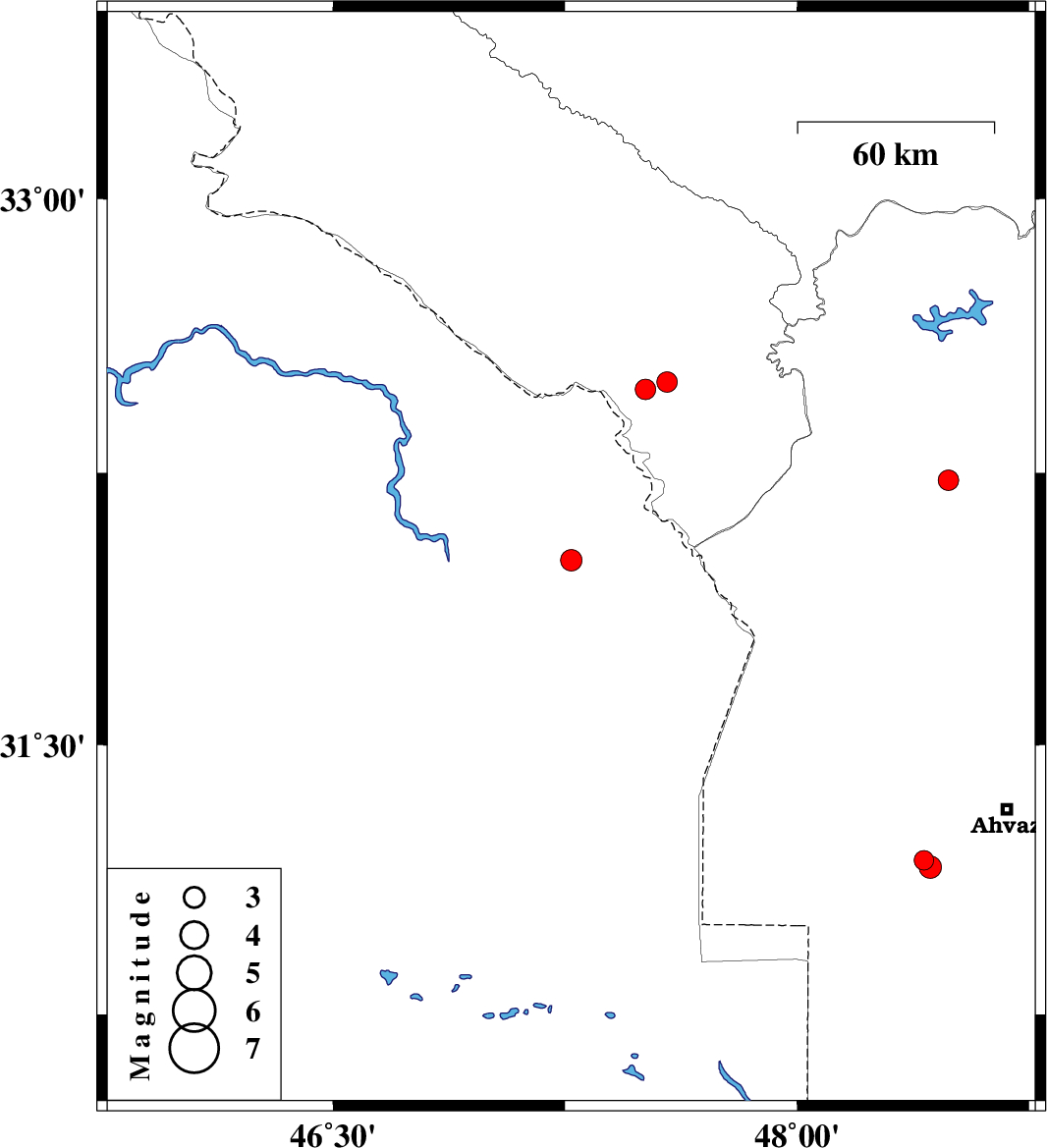 | 2009/02/10 | 15:30:25.2 | 19:00:25.2 | 31.18 | 48.41 | 14 | ML:2.8 | 30 km South-West of Ahvaz, Khoozestan Province | ||
