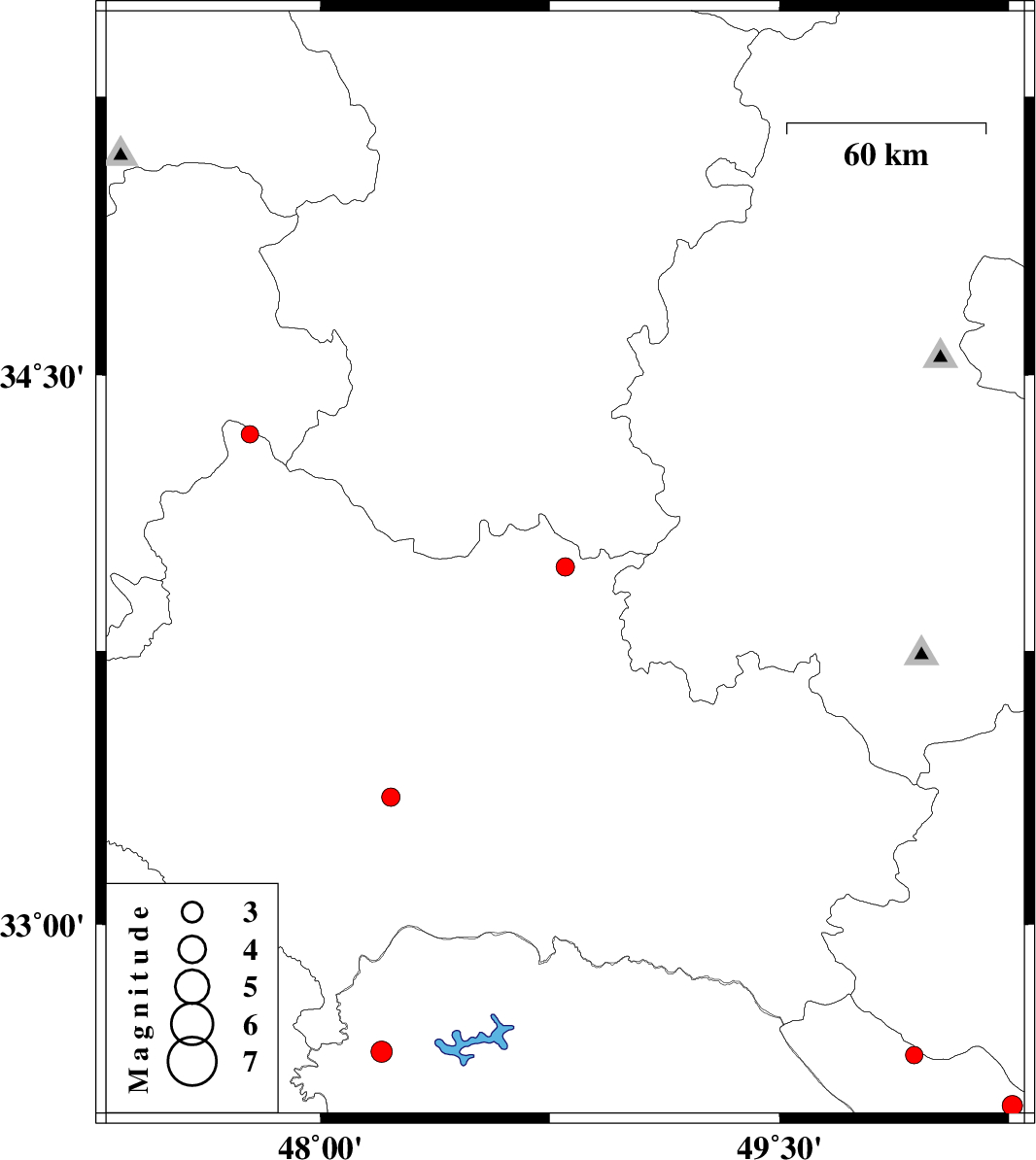 | 2009/01/23 | 01:49:47.7 | 05:19:47.7 | 33.35 | 48.23 | 18 | ML:2.7 | 19 km South-West of Khorramabad, Lorestan Province |
