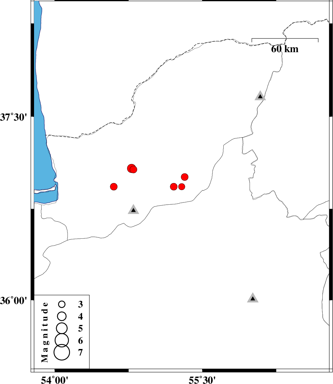 | 2009/02/20 | 19:48:26.2 | 23:18:26.2 | 37.08 | 54.78 | 15 | ML:3.9 | 20 km North of Ali Abad, Golestan Province | ||