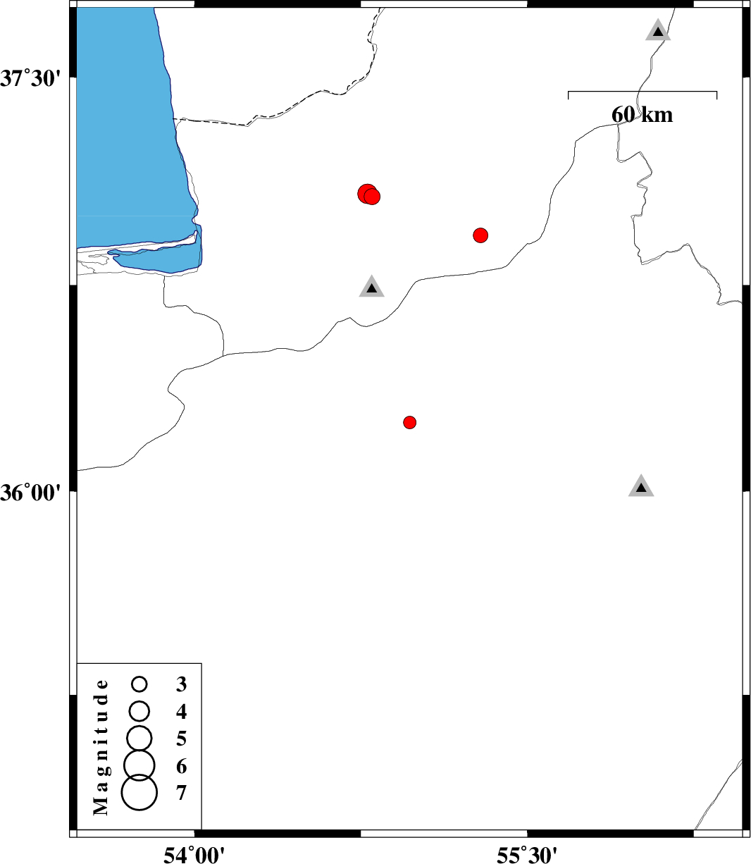 | 2009/02/20 | 19:48:26.2 | 23:18:26.2 | 37.08 | 54.78 | 15 | ML:3.9 | 20 km North of Ali Abad, Golestan Province |