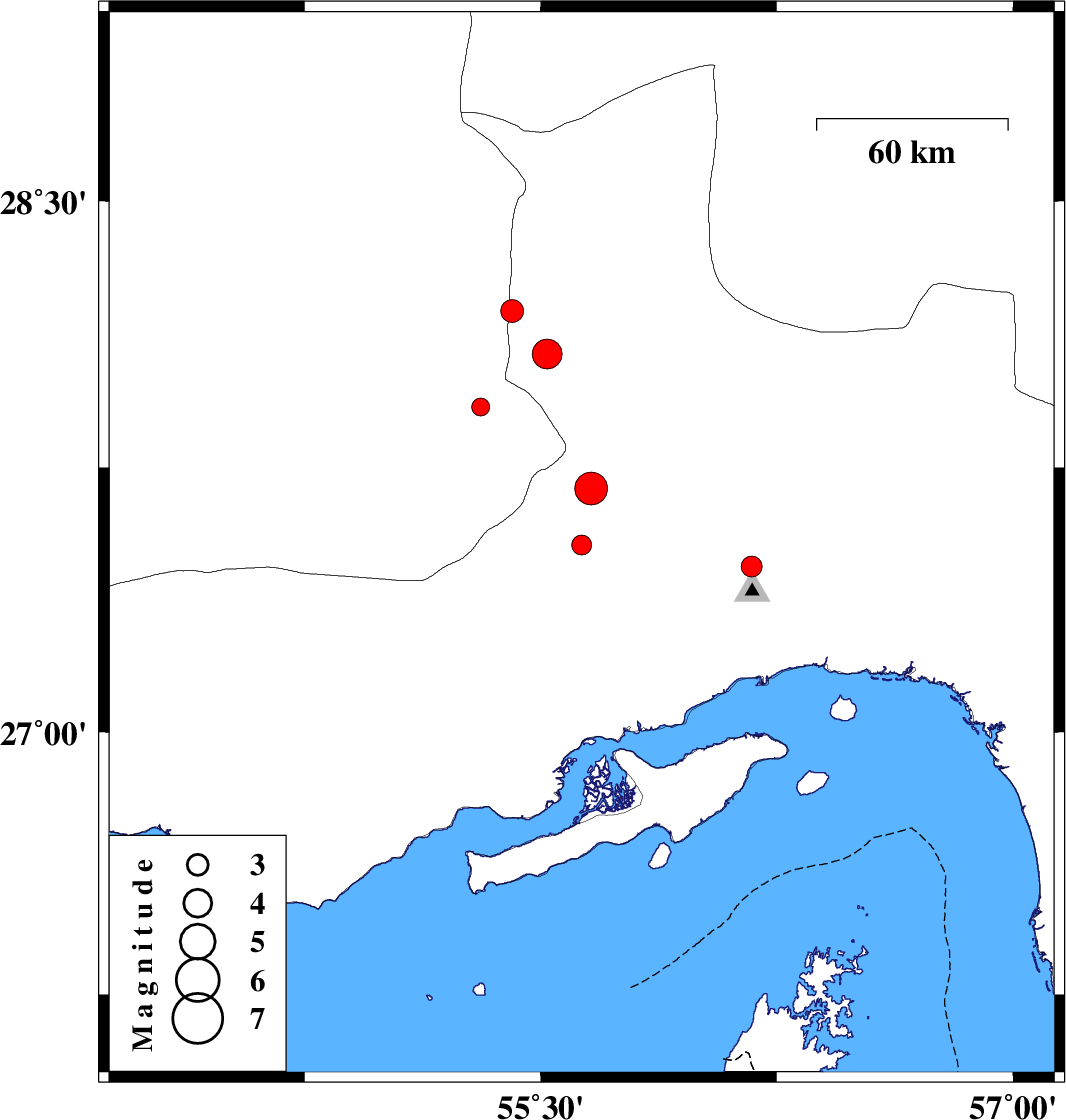 | 2009/02/22 | 20:54:01.3 | 00:24:01.3 | 28.07 | 55.52 | 14 | ML:4.2 | 45 km South-West of Hajiabad, Hormozgan Province |