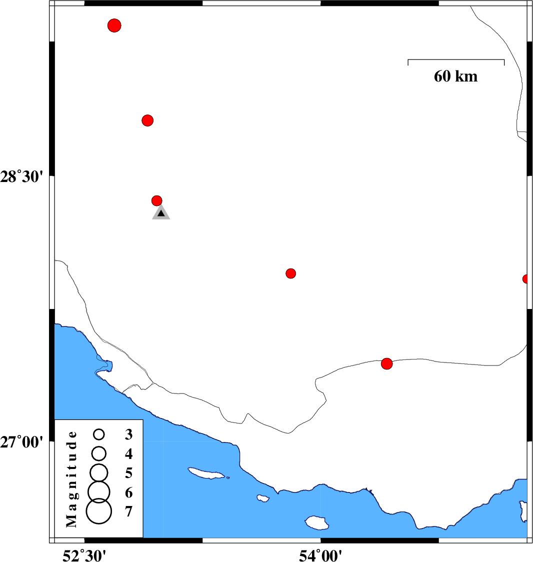 | 2009/02/24 | 23:14:45.0 | 02:44:45.0 | 27.95 | 53.81 | 15 | ML:2.8 | 60 km North-West of Lar, Fars Province | ||