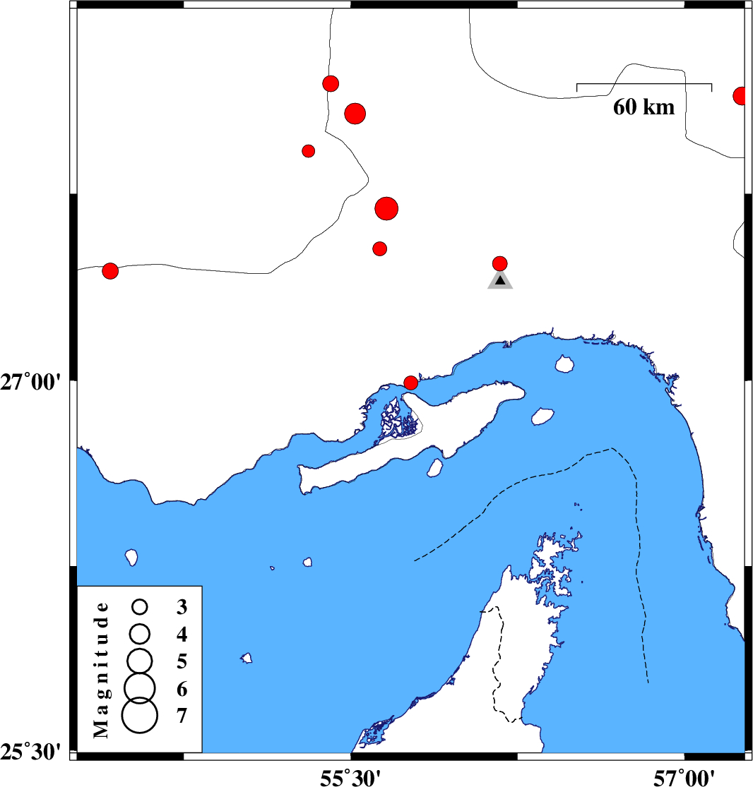 | 2009/02/25 | 01:13:17.0 | 04:43:17.0 | 26.99 | 55.77 | 8 | ML:2.8 | Persian Gulf, 49 km West of Qeshm | ||