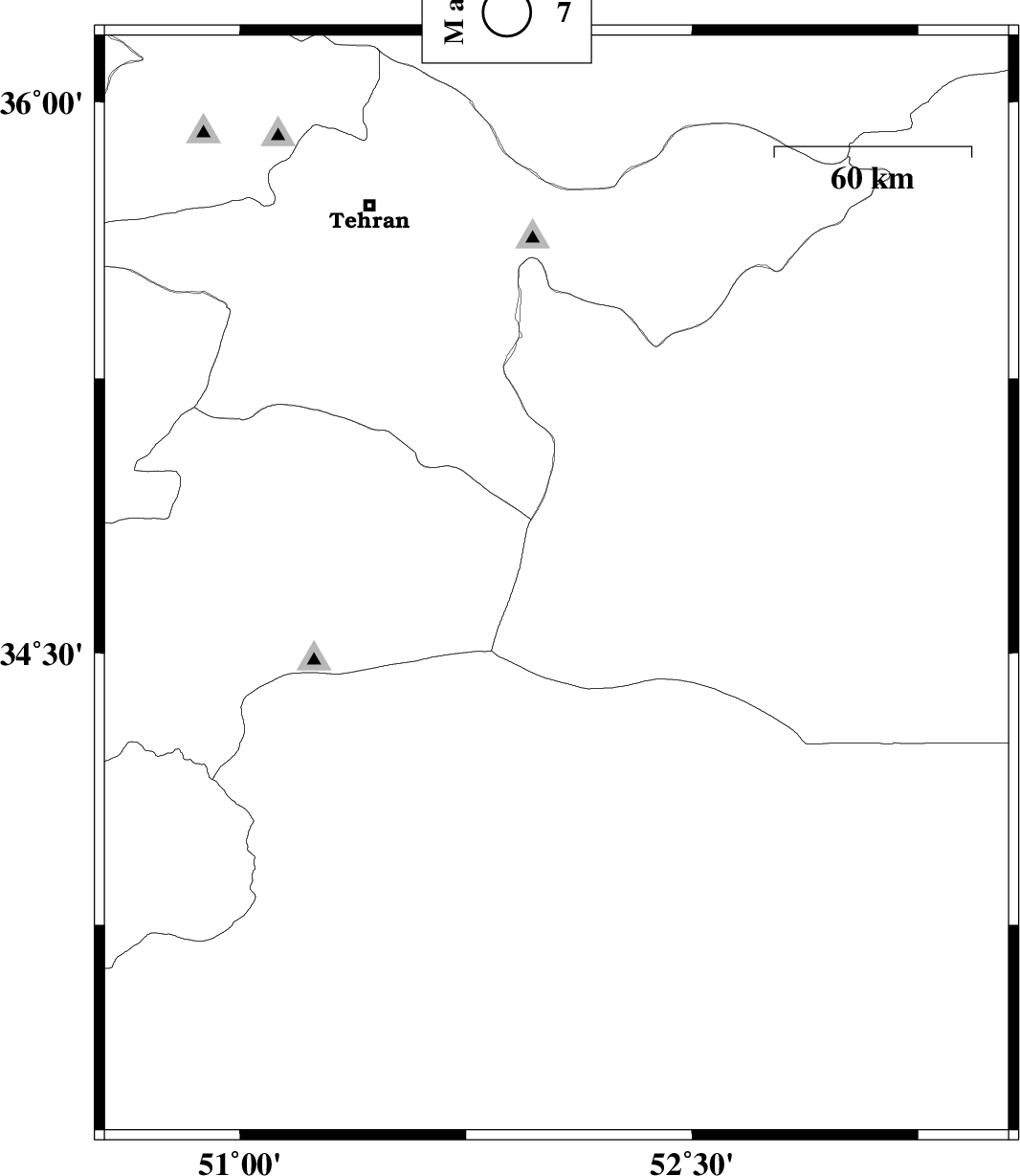 | 2009/02/26 | 08:17:22.1 | 11:47:22.1 | 34.68 | 52.05 | 18 | ML:2.5 | 65 km South-West of Garmsar, Semnan Province | ||