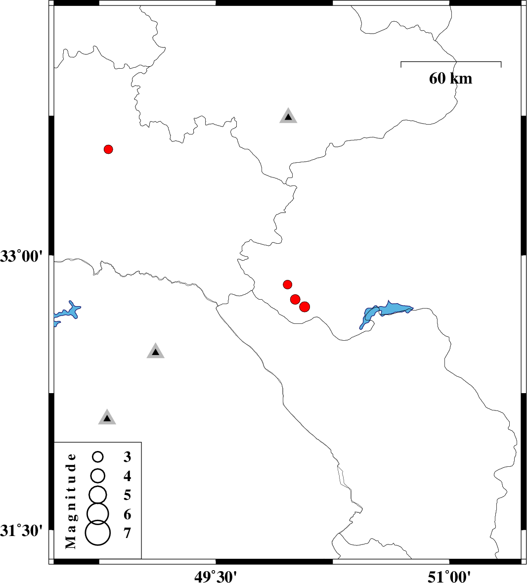 | 2009/03/01 | 06:51:22.3 | 10:21:22.3 | 32.84 | 49.96 | 22 | ML:2.6 | 17 km West of Fereydunshahr, Esfahan Province | ||