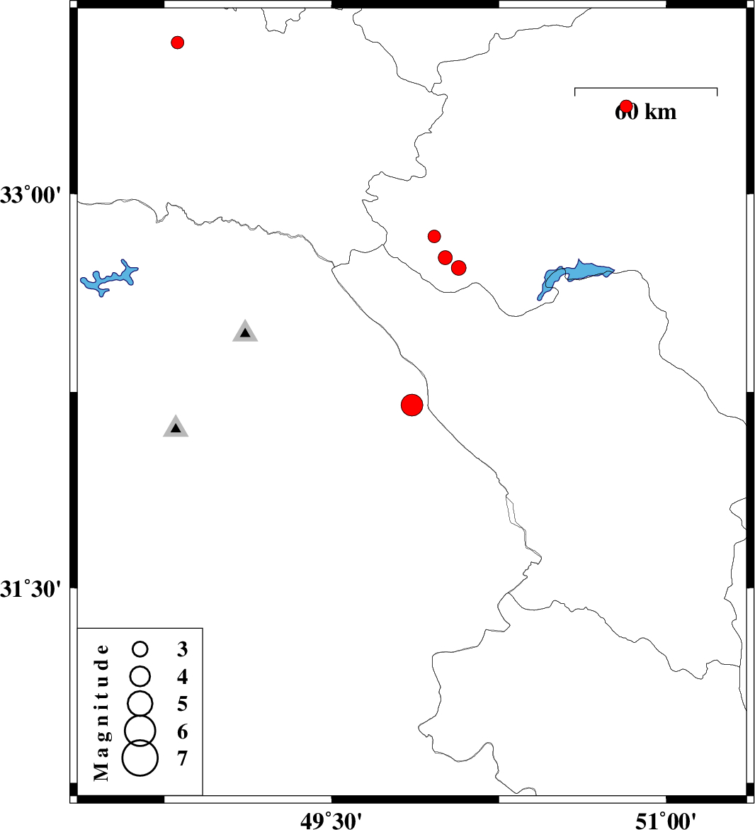 | 2009/03/01 | 06:51:22.3 | 10:21:22.3 | 32.84 | 49.96 | 22 | ML:2.6 | 17 km West of Fereydunshahr, Esfahan Province | ||