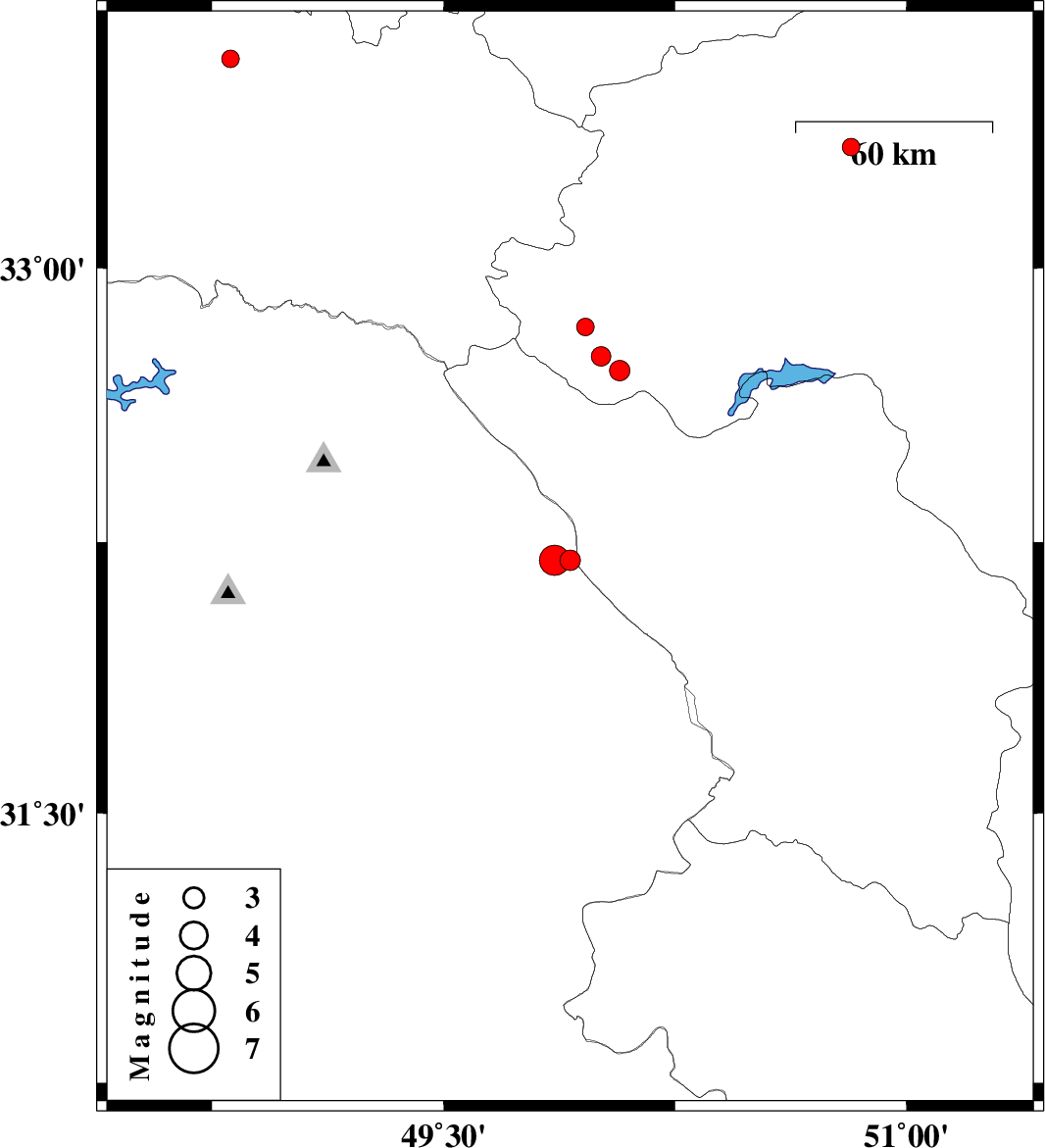 | 2009/03/01 | 06:51:22.3 | 10:21:22.3 | 32.84 | 49.96 | 22 | ML:2.6 | 17 km West of Fereydunshahr, Esfahan Province | ||