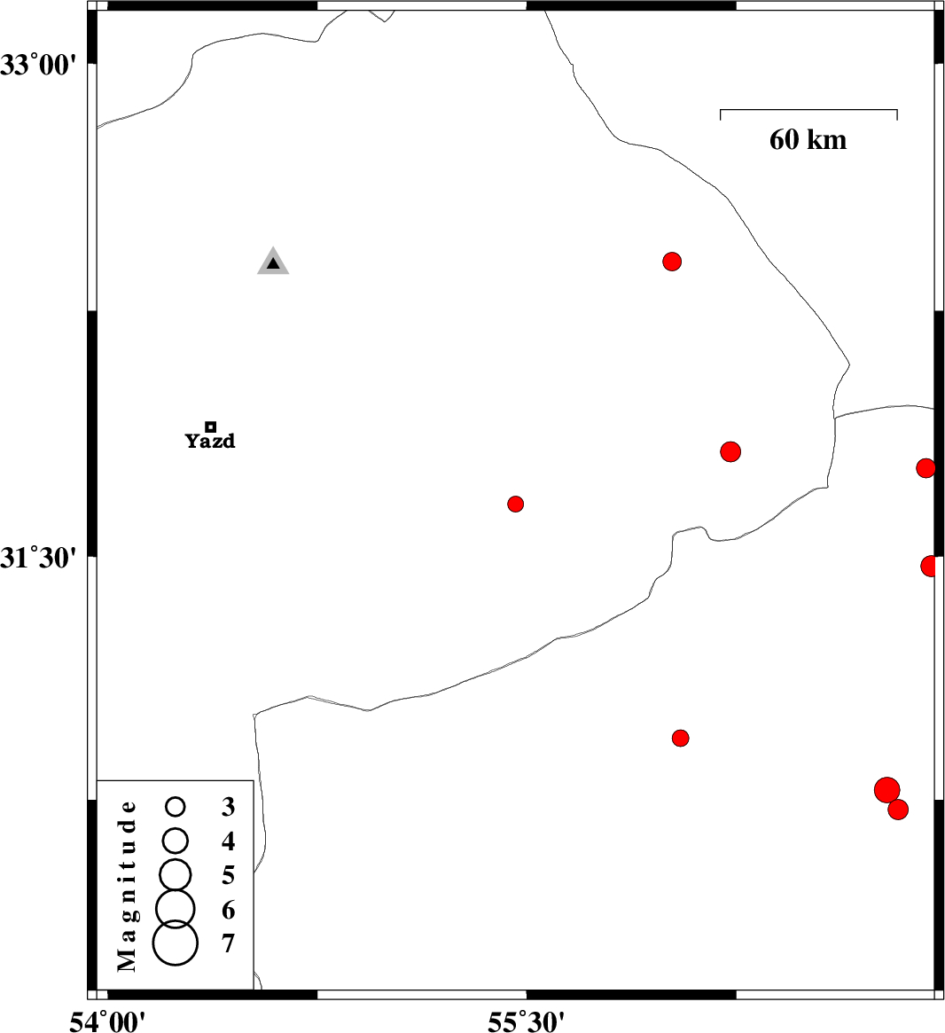 | 2009/03/08 | 10:44:54.1 | 14:14:54.1 | 31.66 | 55.46 | 14 | ML:2.6 | 8 km Bafq, Yazd Province | ||
