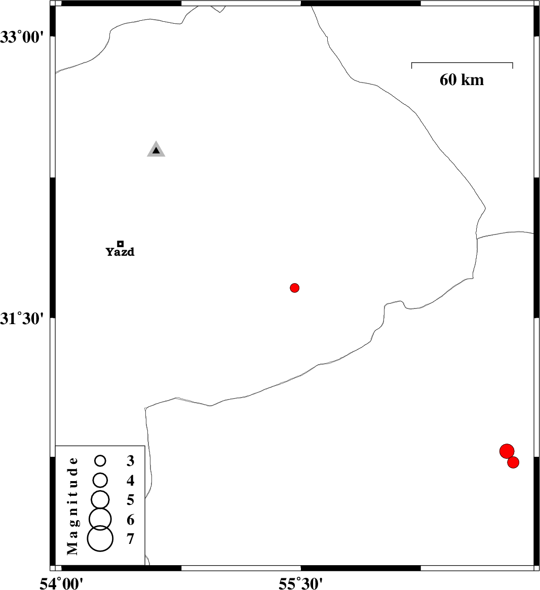 | 2009/03/08 | 10:44:54.1 | 14:14:54.1 | 31.66 | 55.46 | 14 | ML:2.6 | 8 km Bafq, Yazd Province | ||