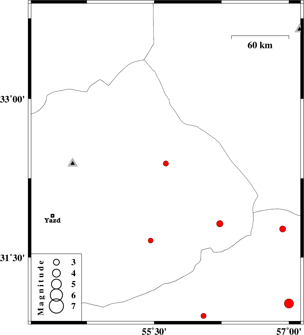 | 2009/03/12 | 09:39:32.6 | 13:09:32.6 | 32.39 | 55.63 | 14 | ML:2.7 | 90 km North-East of Bafq, Yazd Province | ||