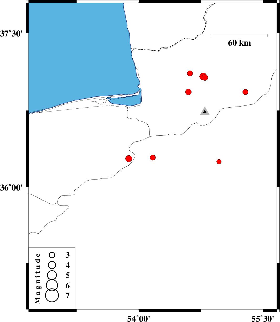 | 2009/02/11 | 12:46:41.6 | 16:16:41.6 | 36.93 | 54.6 | 39 | ML:3.2 | 16 km East of Aq Qaleh, Golestan Province |