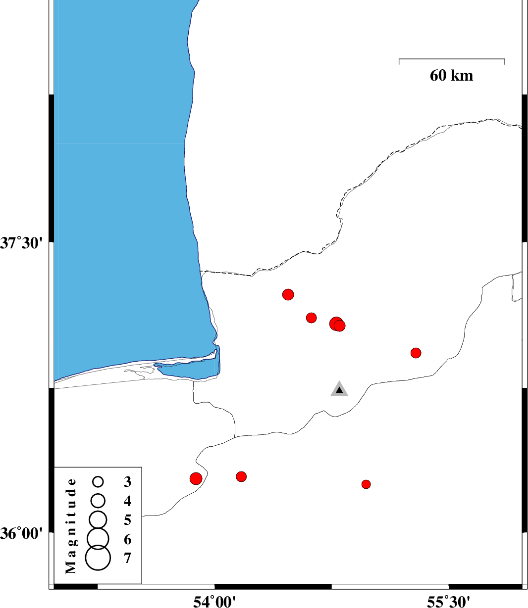 | 2009/02/20 | 19:48:26.2 | 23:18:26.2 | 37.08 | 54.78 | 15 | ML:3.9 | 20 km North of Ali Abad, Golestan Province |