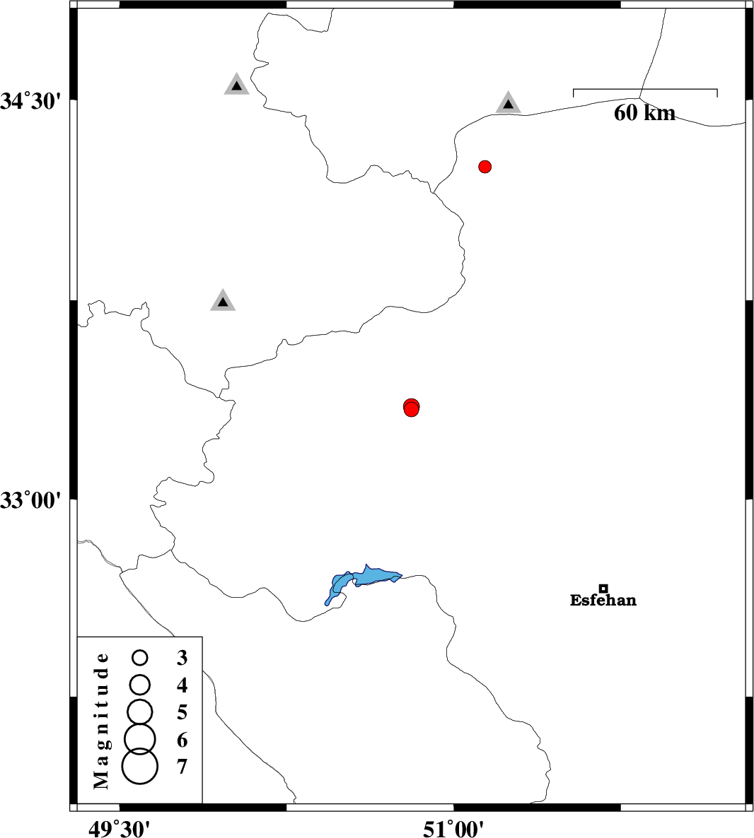 | 2009/03/16 | 11:30:40.6 | 15:00:40.6 | 33.35 | 50.81 | 15 | ML:3.2 | 47 km North-East of Khvansar, Esfahan Province |