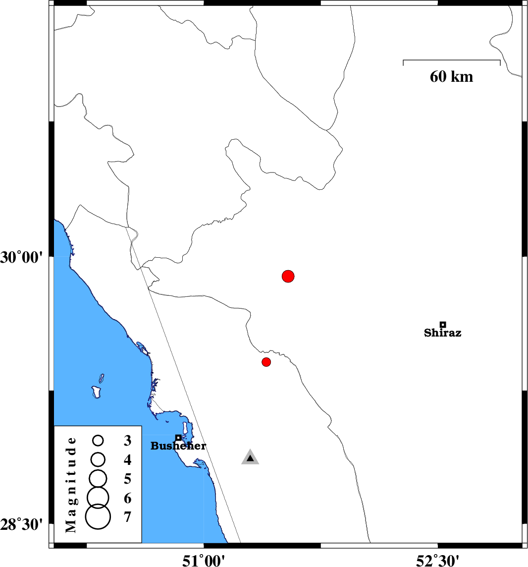 | 2009/03/20 | 23:24:10.6 | 02:54:10.6 | 29.41 | 51.4 | 18 | ML:2.6 | 25 km North-East of Borazjan, Bushehr Province |