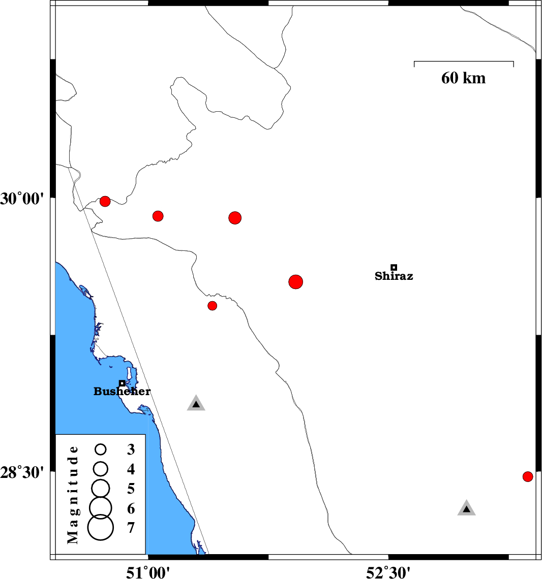 | 2009/03/24 | 15:45:10.0 | 20:15:10.0 | 29.54 | 51.92 | 46 | ML:3.9 | 26 km East of Kazerun, Fars Province | ||