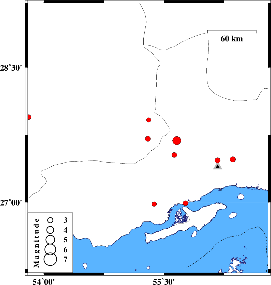 | 2009/02/25 | 01:13:17.0 | 04:43:17.0 | 26.99 | 55.77 | 8 | ML:2.8 | Persian Gulf, 49 km West of Qeshm | ||