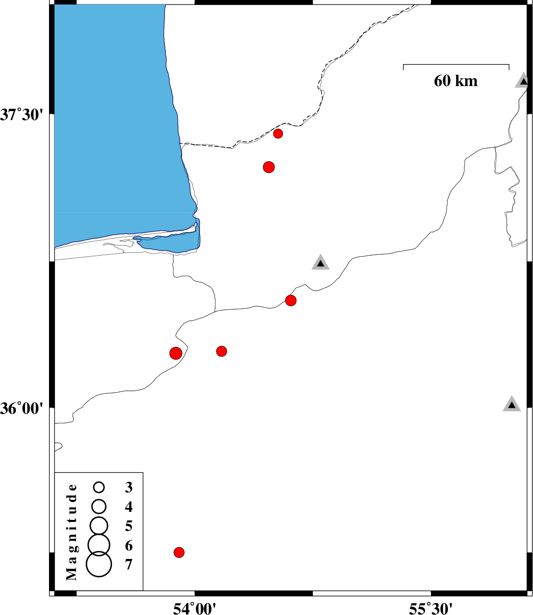| 2009/03/16 | 06:17:09.1 | 09:47:09.1 | 37.23 | 54.47 | 14 | ML:3.2 | 23 km North of Aq Qaleh, Golestan Province | ||