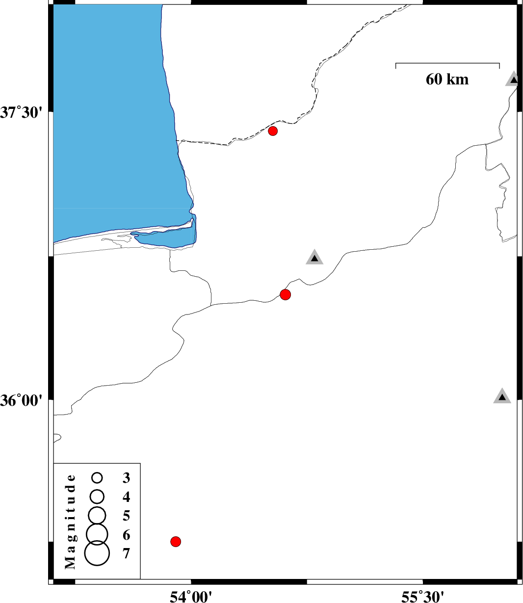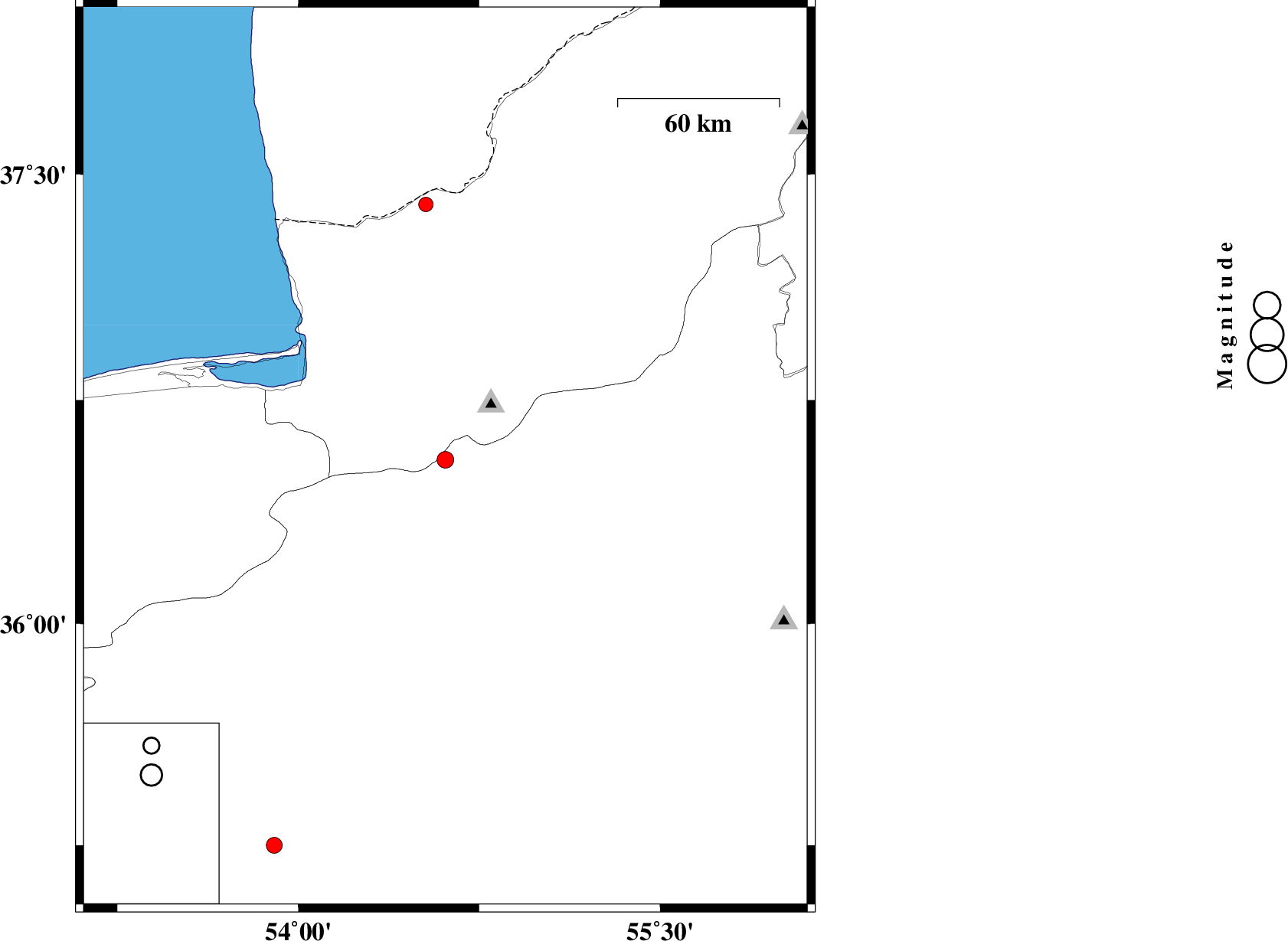 | 2009/03/26 | 07:05:56.7 | 11:35:56.7 | 37.4 | 54.53 | 15 | ML:2.7 | 43 km North of Aq Qaleh, Golestan Province | ||