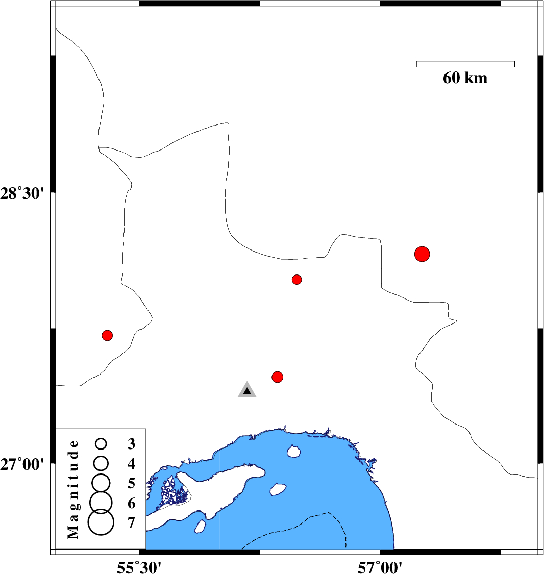 | 2009/03/01 | 20:20:11.7 | 23:50:11.7 | 26.98 | 55.38 | 16 | ML:2.7 | 73 km North-East of Bandar-e lengeh, Hormozgan Province |