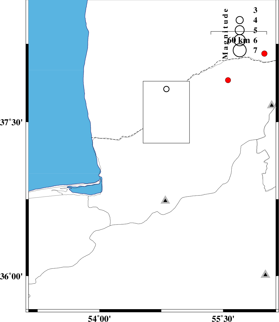 | 2009/03/26 | 07:05:56.7 | 11:35:56.7 | 37.4 | 54.53 | 15 | ML:2.7 | 43 km North of Aq Qaleh, Golestan Province | ||