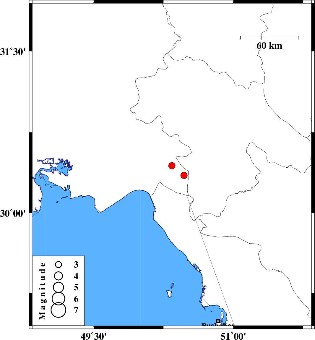 | 2009/03/30 | 02:02:58.2 | 06:32:58.2 | 30.35 | 50.47 | 14 | ML:3.3 | 30 km West of Dogonbadan, Kohkiluieh va boyerahmad Province |