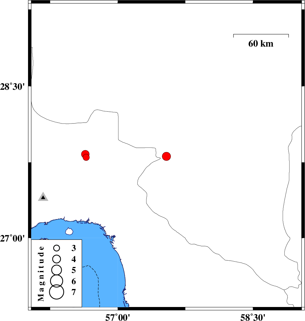 | 2009/04/07 | 12:07:39.5 | 16:37:39.5 | 27.8 | 56.65 | 14 | ML:3.2 | 71 km North-West of Dehbarez, Hormozgan Province | ||