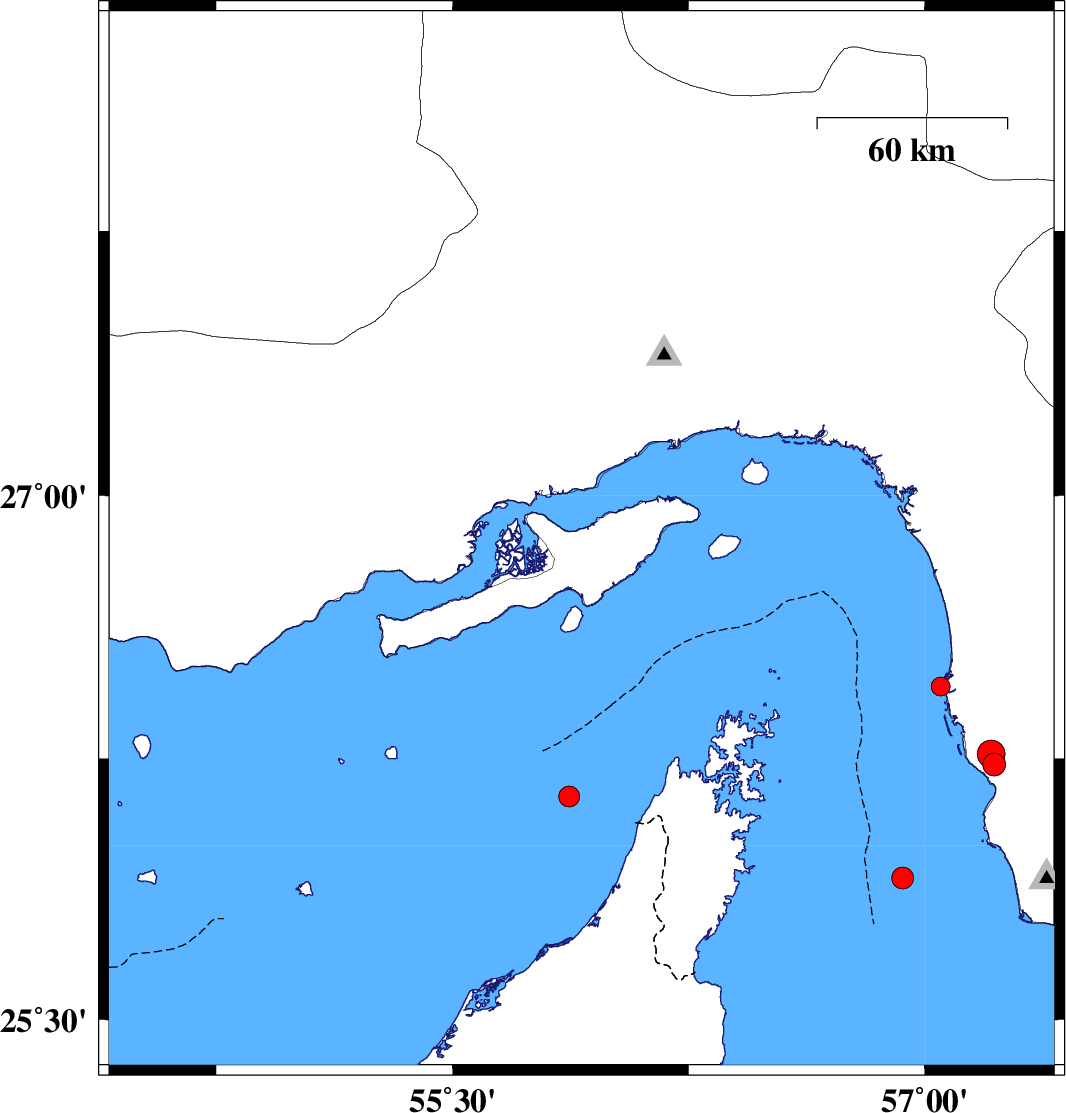 | 2009/04/14 | 05:10:26.6 | 09:40:26.6 | 26.87 | 55.91 | 8 | ML:3.8 | Persian Gulf, 36 km West of Qeshm | ||