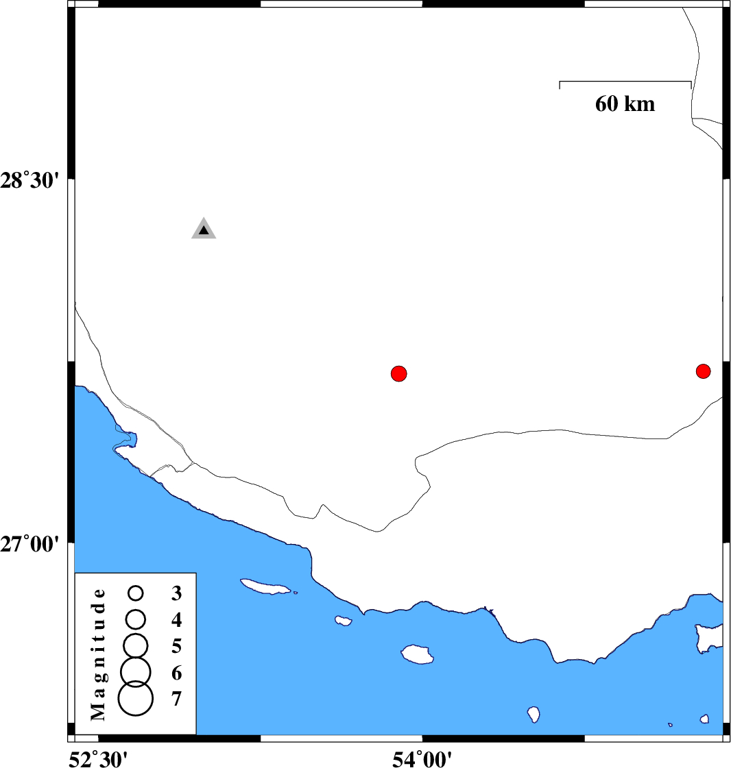 | 2009/04/14 | 18:33:42.2 | 23:03:42.2 | 27.7 | 53.89 | 15 | ML:3.3 | 44 km West of Lar, Fars Province | ||