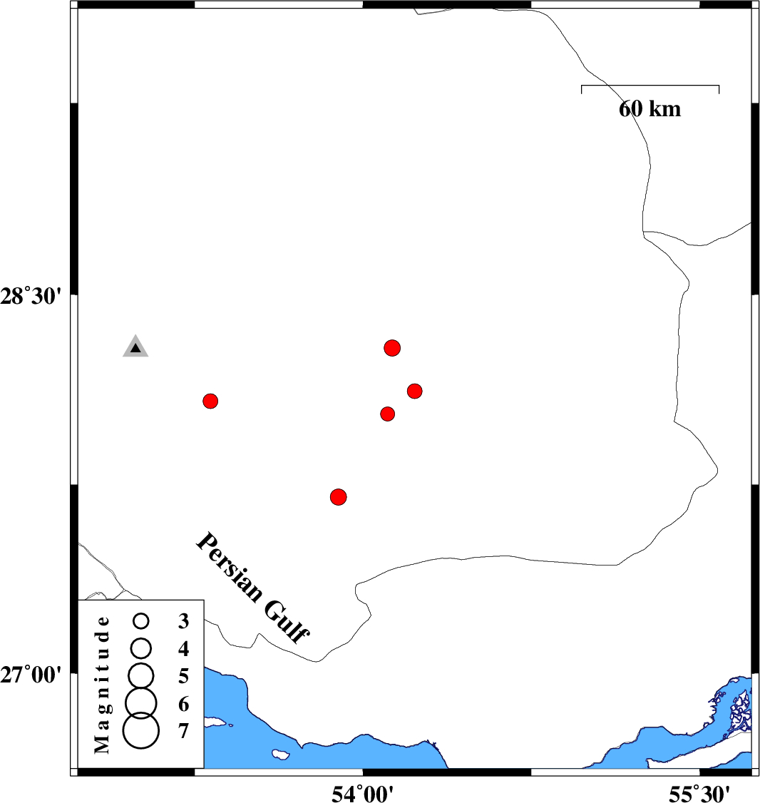 | 2009/04/20 | 03:47:42.8 | 08:17:42.8 | 28.08 | 53.32 | 14 | ML:2.9 | 51 km South-East of Qir va Karzin, Fars Province | ||