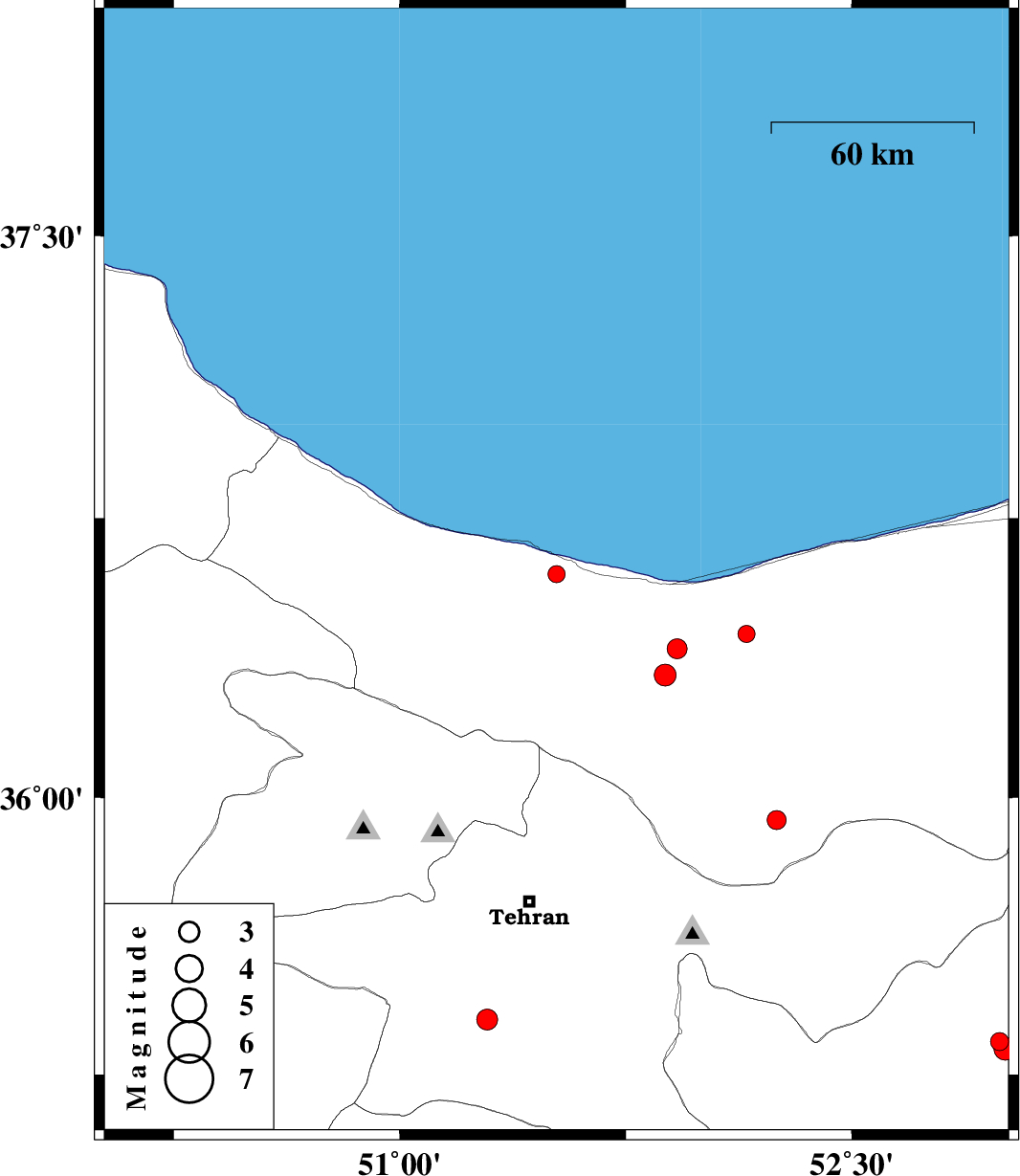 | 2009/04/23 | 00:03:51.4 | 04:33:51.4 | 36.6 | 51.52 | 16 | ML:2.5 | 5 km Nowshahr, Mazandaran Province | ||