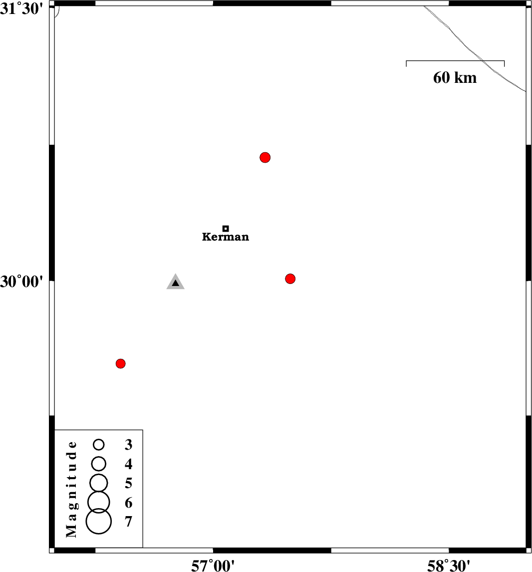 | 2009/04/04 | 22:34:26.3 | 03:04:26.3 | 30.68 | 57.33 | 18 | ML:2.9 | 49 km North-East of Kerman, Kerman Province | ||