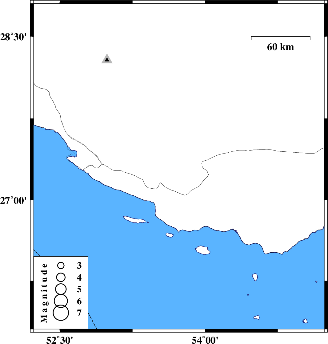 | 2009/04/29 | 07:10:20.2 | 11:40:20.2 | 27.3 | 53.73 | 18 | ML:2.7 | 55 km East of Lamerd, Fars Province |