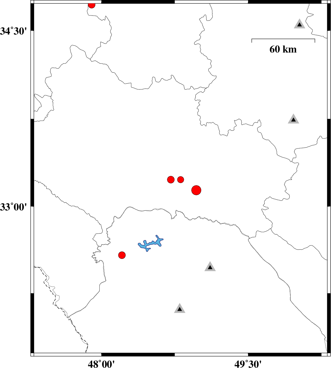 | 2009/04/29 | 21:19:27.2 | 01:49:27.2 | 33.23 | 48.81 | 6 | ML:2.9 | 37 km South-West of Dorud, Lorestan Province | ||