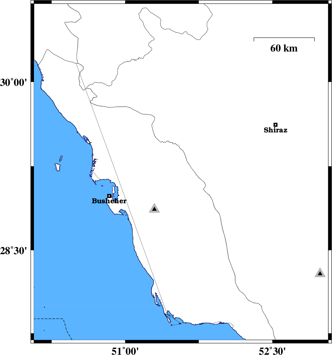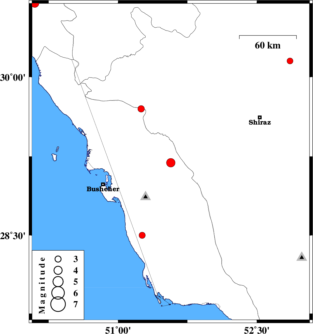 | 2009/04/02 | 17:44:06.7 | 22:14:06.7 | 29.7 | 51.25 | 15 | ML:3.2 | 39 km West of Kazerun, Fars Province |