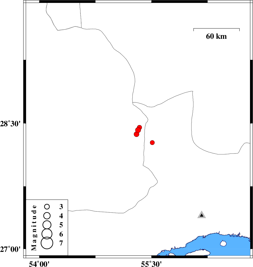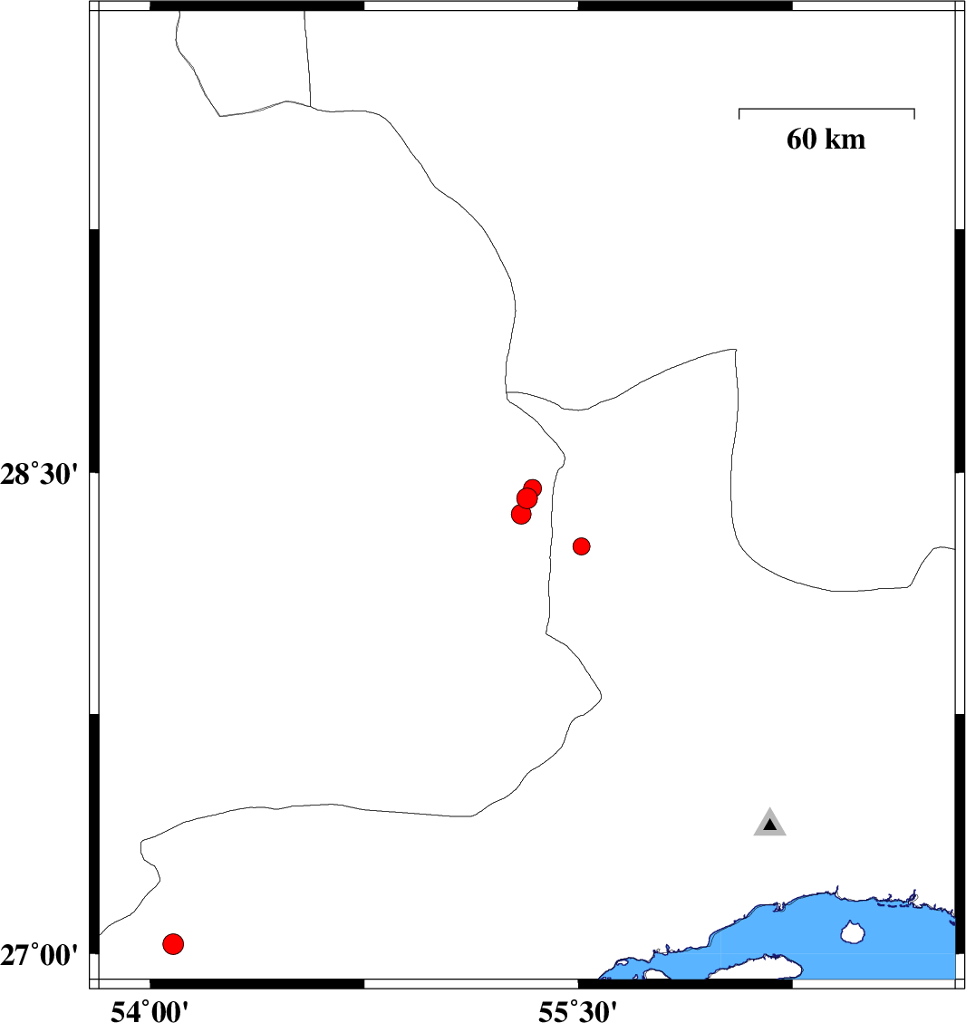 | 2009/05/06 | 05:14:03.6 | 09:44:03.6 | 27.03 | 54.08 | 14 | ML:3.2 | 33 km South-West of Bastak, Hormozgan Province | ||
