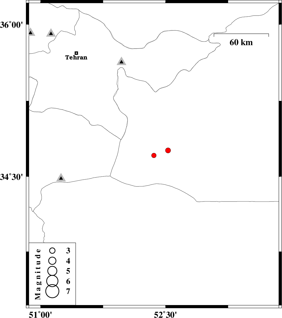 | 2009/05/06 | 14:58:05.6 | 19:28:05.6 | 34.76 | 52.53 | 28 | ML:2.8 | 54 km South-East of Garmsar, Semnan Province | ||
