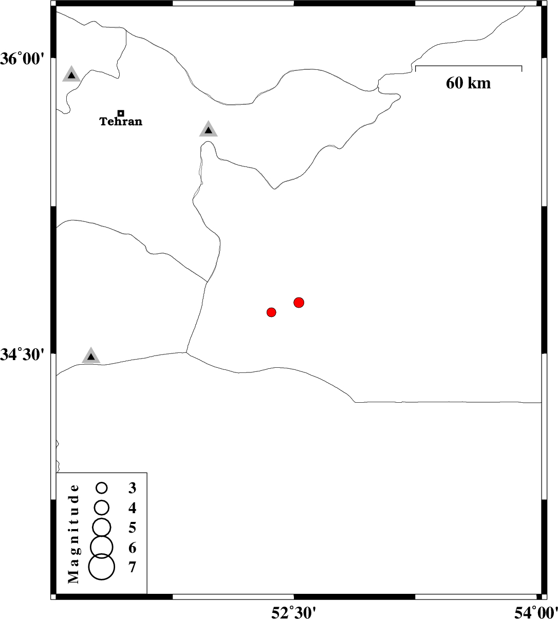 | 2009/05/06 | 14:58:05.6 | 19:28:05.6 | 34.76 | 52.53 | 28 | ML:2.8 | 54 km South-East of Garmsar, Semnan Province | ||