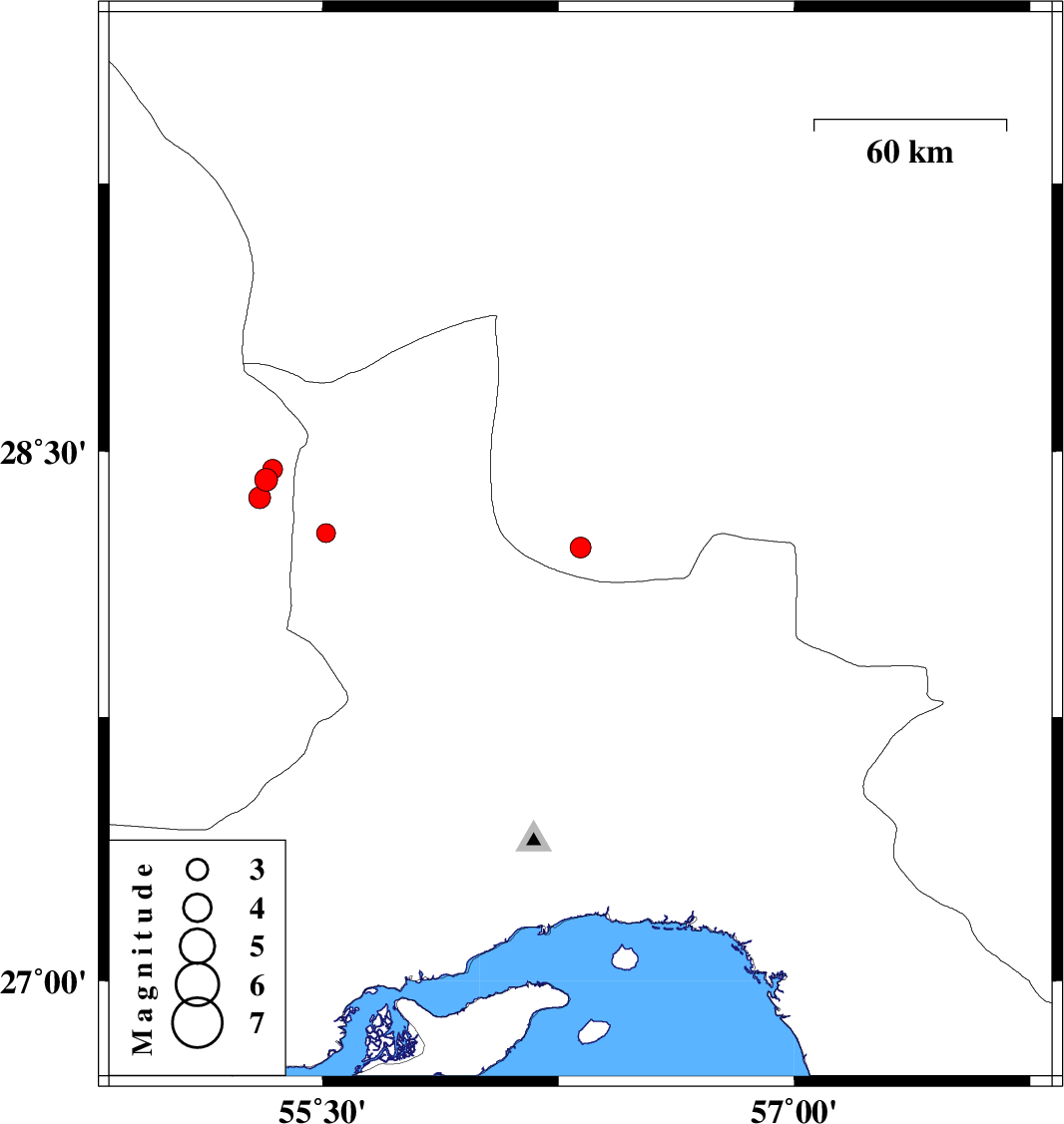 | 2009/04/30 | 16:37:11.0 | 21:07:11.0 | 28.27 | 55.51 | 46 | ML:2.7 | 38 km West of Hajiabad, Hormozgan Province | ||