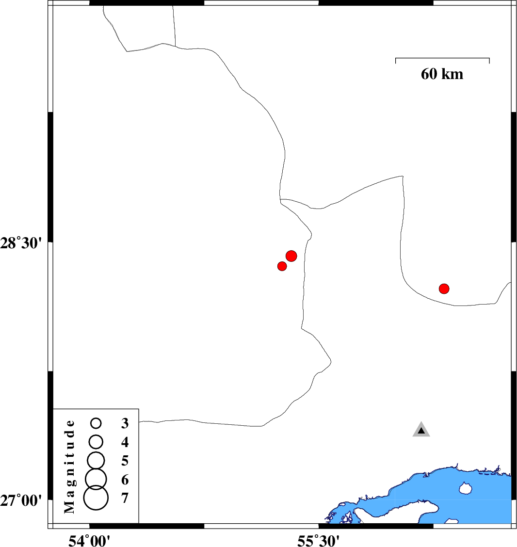 | 2009/05/06 | 05:14:03.6 | 09:44:03.6 | 27.03 | 54.08 | 14 | ML:3.2 | 33 km South-West of Bastak, Hormozgan Province |